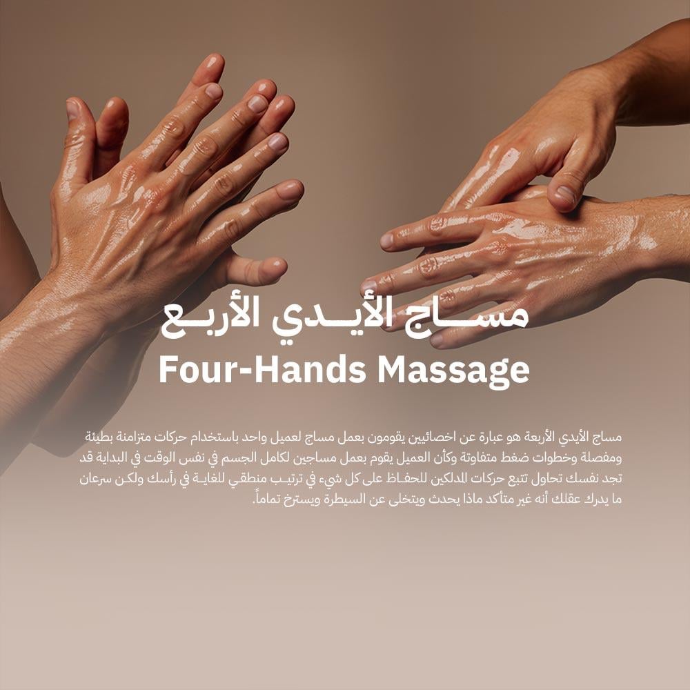 جلسة فاخرة من نوع خاص، يقوم فيها اثنان من المختصين بتنفيذ حركات متزامنة ومدروسة على كامل الجسم، وكأنك تخضع لمساجين في آنٍ واحد. يُركّز هذا النوع من المساج على التناغم الحسي الكامل بين الحركة والإحساس، مما يخلق تجربة استرخاء لا يشبهها شيء.